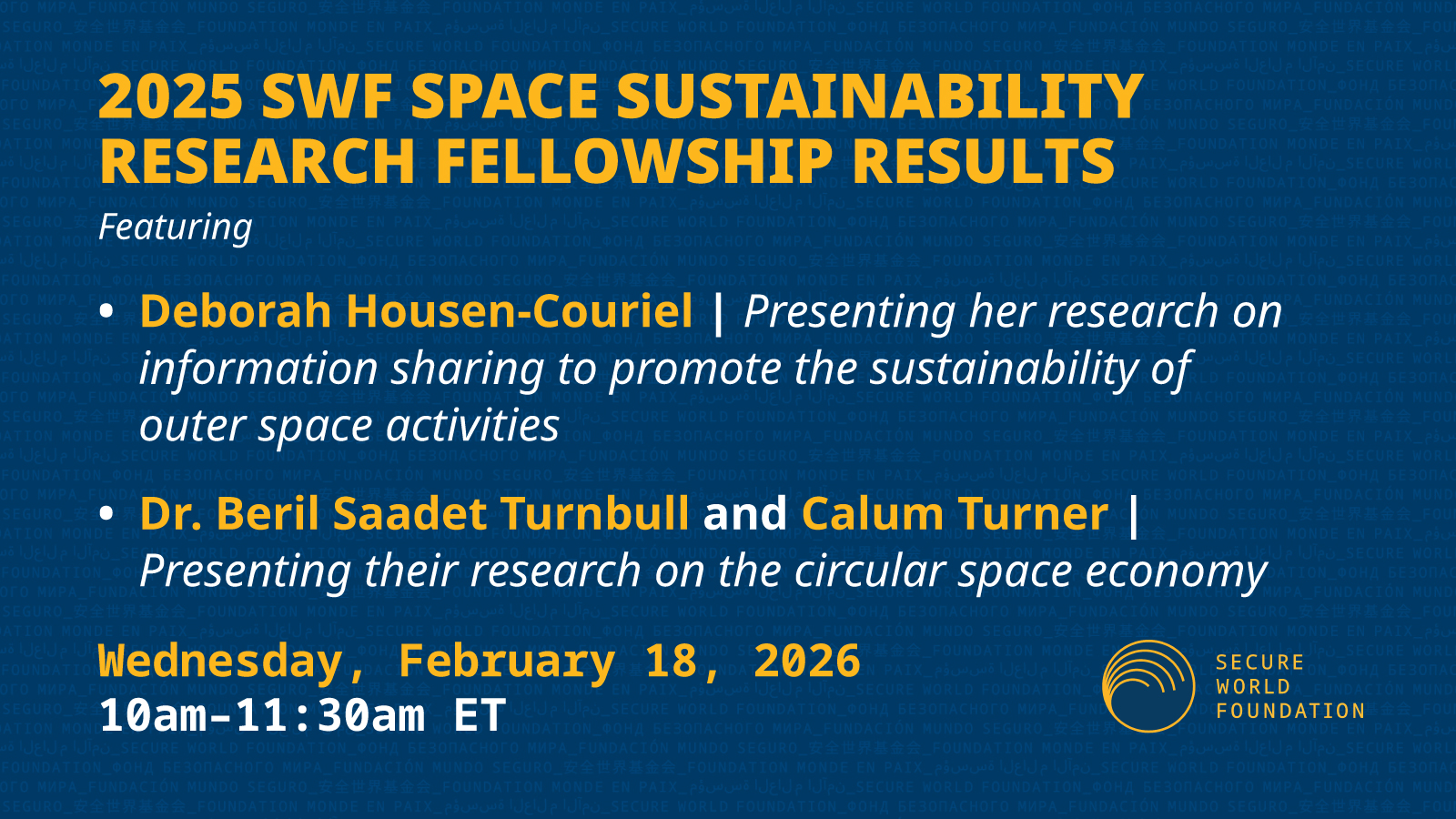 Please join the Secure World Foundation for a webinar featuring the 2025 Space Sustainability Research Fellows as they present findings from their research on two core issues shaping space sustainability today: information sharing and the circular space economy.