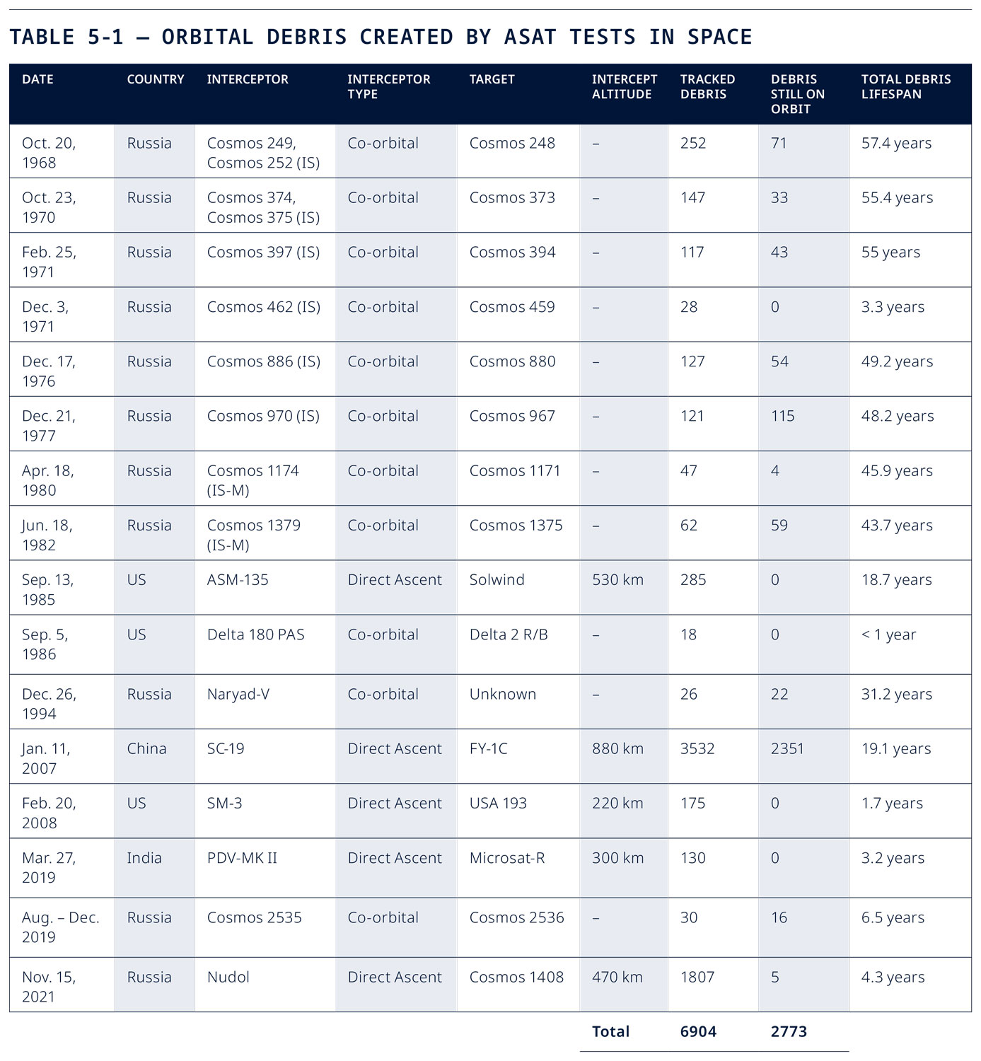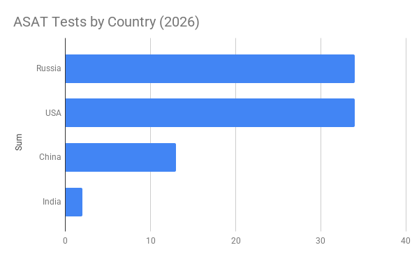 - The 2026 report updated the amount of space debris created by the United States, Russia, China, & India from their counterspace testing: there were 6904 cataloged pieces of debris from tests, of which 2773 are still on orbit.