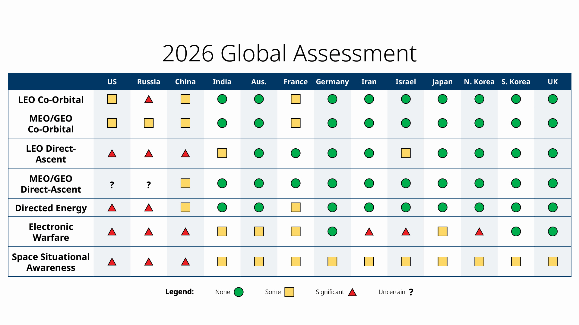 - The 2026 edition documents the continued development of counterspace capabilities by 13 countries. While we see a proliferation of R&D into counterspace capabilities, only non-destructive counterspace capabilities are being used in active military conflicts.